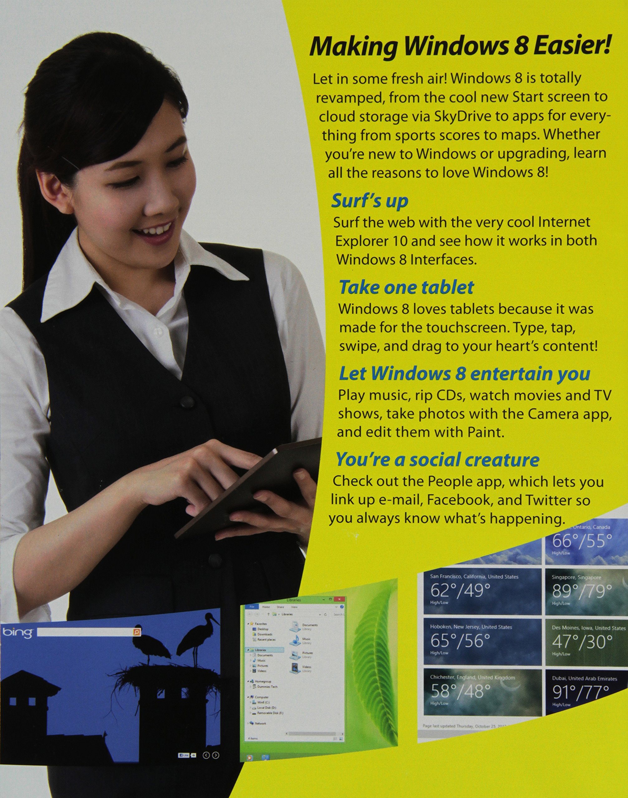 Get up to speed on Windows 8! Exploring Windows 8 For Dummies packs 168 pages of magazine–style articles, lavish illustrations, and great tips into an eye–catching publication that shows you how to use the new Windows 8 operating system from start to finish. Explore new features, like the touchscreen–style interface, a big change from the classic Windows look and feel. Ideal for the reader who is already familiar with the Windows operating system, but just needs the basics on the move to Windows 8, you′ll also discover new apps, new ways to handle traditional tasks, and much more. Helps readers get up to speed quickly and get the most out of the new Windows 8 operating system Breaks down Windows 8 features and functions into a series of magazine–style spreads that offer full–color illustrations and step–by–step instruction Offers a value–priced helping hand to readers who want the basics of Windows 8 Covers new Windows 8 features, getting e–mail and getting online, organizing pictures, exploring the app market, networking, printing, troubleshooting, and more Explore Windows 8 and enjoy the ride with this fun and unique new guide.