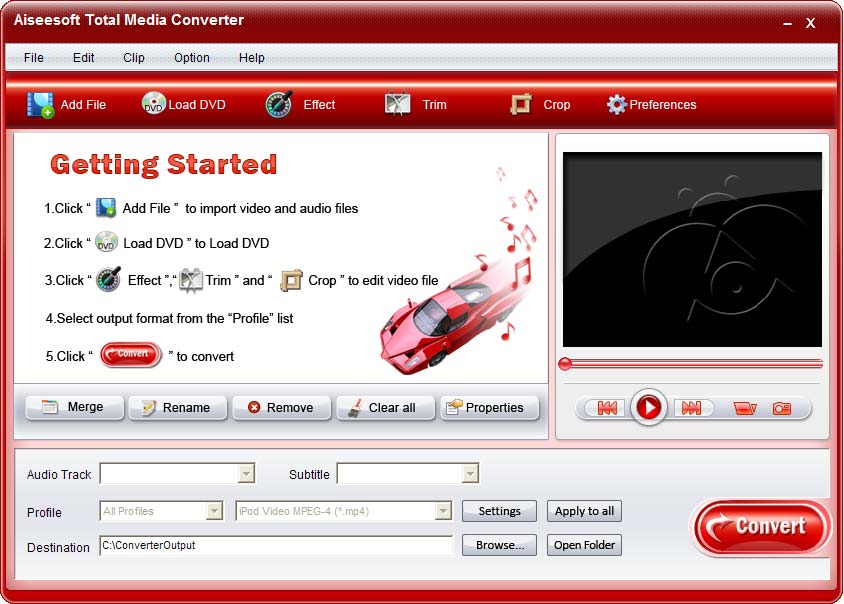 * Aiseesoft Total Media Converter can rip DVD, convert any video/audio files to all popular video and audio files with powerful editing functions (Merge, Trim, Crop, Effect and edit watermark).
