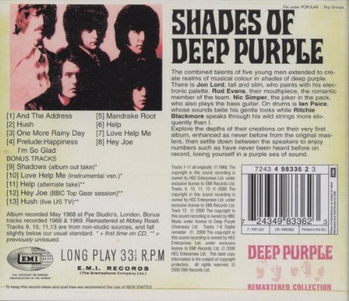 After about two months of rehearsals, Shades of Deep Purple was recorded in only three days in May 1968 and contains four original songs and four covers, thoroughly rearranged to include classical interludes and sound more psychedelic. Stylistically the music is close to psychedelic rock and progressive rock, two genres with an ever growing audience in the late 60s.