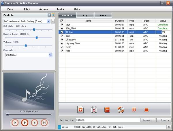 Encoding Audio files to burn new CD for backup or ripping music/audio from CD on your computer to share with your cyber-friend. Now these two processes can be operated at one go with one-in-all software named 3herosoft Audio Encoder. It allows you to encode audio files for burning music CD, or fast rip your music CD track with multiple profiles on computer. And three main functions are involved:
