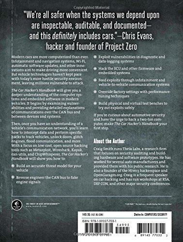 The Car Hacker's Handbook is a guide for the security-minded that shows how to identify network security risks, exploit software vulnerabilities, and gain a deeper understanding of the software running in our vehicles. Along the way you'll learn how navigation systems can be hacked to take control of vehicles, how systems are interconnected, even how to bypass dealership restrictions to diagnose and troubleshoot problems.