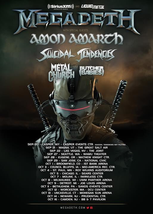 BUTCHER BABIES has replaced HAVOK on the billing of the upcoming MEGADETH tour with AMON AMARTH, SUICIDAL TENDENCIES and METAL CHURCH. The trek kicks off on September 20 in Casper, Wyoming and runs through October 15 in Camden, New Jersey.