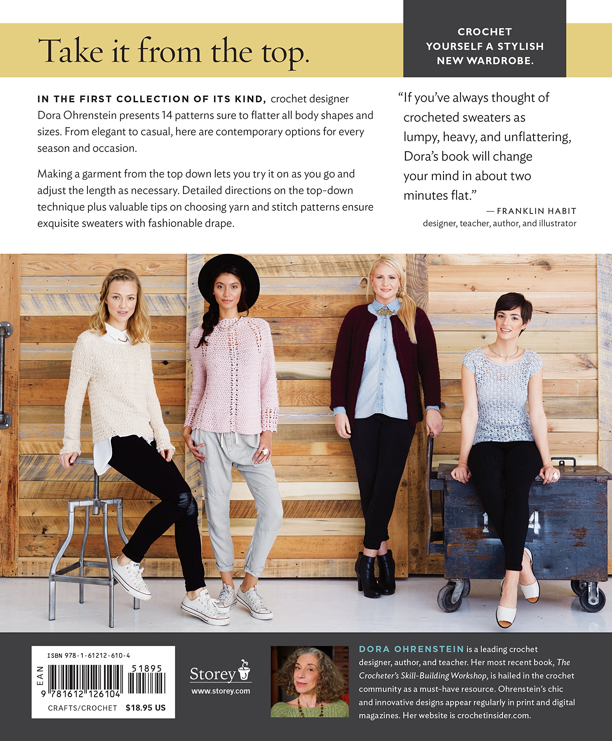 Welcome to the new era of crochet. Making garments from the top down is a favourite knitting technique that allows knitters to test and adjust the fit as they go. Now, thanks to designer Dora Ohrenstein, crocheters will benefit for the first time from a pattern book featuring the same beloved approach. These 14 fashionable patterns are sure to flatter bodies of all shapes and sizes. Show-stopping original photography, an extensive discussion of the benefits of top-down construction, and detailed instructions on how and why to adjust the patterns to ensure an exquisite customised fit will have crocheters tying themselves in knots to start strutting their stuff!