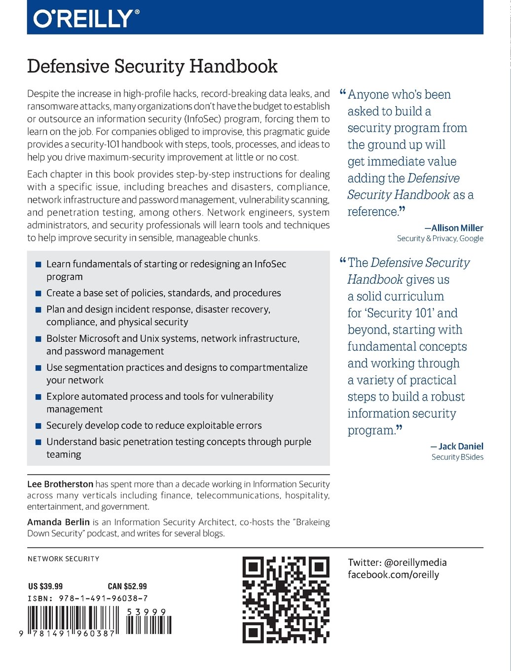 Each chapter in this book provides step-by-step instructions for dealing with a specific issue, including breaches and disasters, compliance, network infrastructure and password management, vulnerability scanning, and penetration testing, among others. Network engineers, system administrators, and security professionals will learn tools and techniques to help improve security in sensible, manageable chunks.