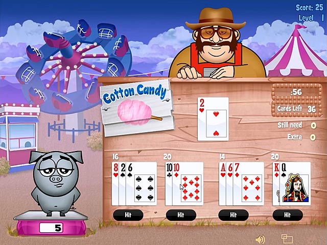 Master the game of Snackjack and help keep your prize pig fed before he decides to run away for good! Each black jack hand will help your pig grow and win even more awards! Earn bonus points for straights and 5-card charlies as you progress through as many vendor stands as you can. Raise a champion swine, then build a home for your best pigs at Sleepy Wallow farm in Snackjack!