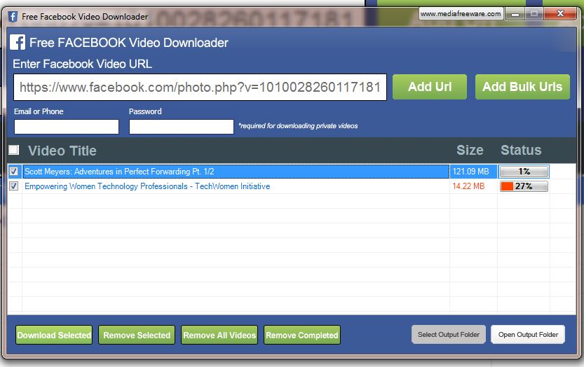 The Facebook video downloader is a simple program that facilitates users to download videos from Facebook. This free software program has a simple user interface. The free Facebook video downloader allows users to copy the program files into any storage device or hard drive. The program need not be installed in the computer. It is basically a desktop application that allows users to download Facebook videos with a simple click. The downloading process is quite simple and quick. However the entire process depends on the performance of the computer. Users need to paste the URL in the box and click on the button Get Links and then select the output location. This software application displays different qualities of videos. Users can easily download open and save it in MP3 formats. The software application also includes a progress bar which showcases the time period required for the download process to complete. This free Facebook video downloader can be used to download video files and convert it into MP4 format. The program allows the users to download the videos and play it without an internet connection by saving it on the sdcard. This software application is quite simple to understand and use. It includes simple features and the downloading process is speedy and accurate. It also features optimum sound and picture quality among the other attractive features. This software app is a handy tool that can convert Facebook videos to MP3 and MP4 format. The application includes all the features which are essential to download videos from Facebook in a simple and quick manner. The program can be stored in hard drives such as a USB flash drive so that it can be used on any computer as required.