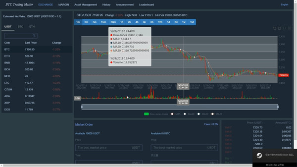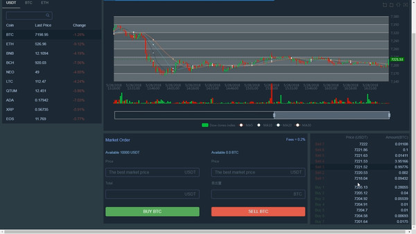 This is a simulation of the digital currency trading game,the data is synchronized in real-time from online exchanges (such as: GDAX, BINANCE). You can learn how to trade digital currency in this game. The game currently supports more than 100 kinds of digital currency exchanges.