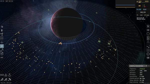 Gather resources, construct space ships and stations, produce fuel, generate energy, trade between stations, complete contracts or fight with pirates in a 2D world where everything in constant orbital motion, without "air friction" and without maximum speed limits.