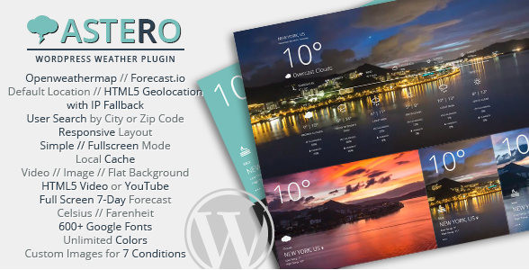 Astero utilizes Ajax technology and local caching for fast loading of weather forecasts that supports a fixed location or user geolocation. Optional search function lets users look up the weather with a city name or zip code, and choose their preferred units!