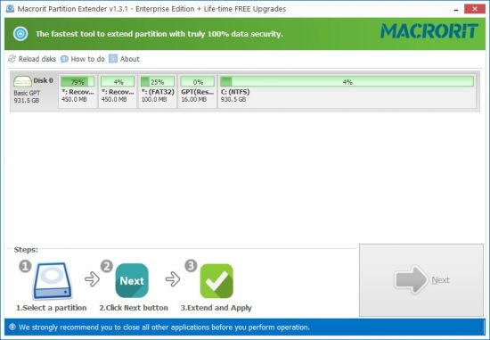 >The great difference between other partition managers is that, Partition Extender owns the fastest speed in extending partition with data untouched, if you are going to extend partition that Partition Extender installed in, no matter how many steps you are clicked, how many partitions you extended, Extender will only reboot once, unlike others in disk manager which reboots based on steps and partitions.