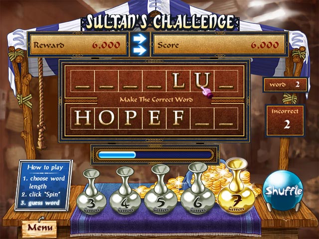 Have a way with words? Savvy with spelling? Use these skills in SandScript to decipher mystery words, one letter at time and help our hapless genie restore his magical powers. Score bonus points for making correct guesses consecutively and quickly. Collect treasures and awards along the way as you journey from the Lonely Pyramids to the Ivory Palace and see how far your smarts will take you!