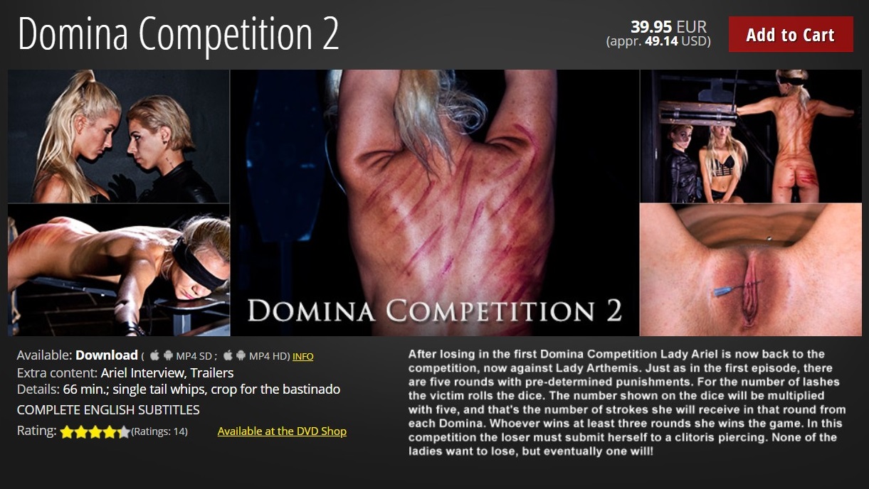 After losing in the first Domina Competition Lady Ariel is now back to the competition, now against Lady Arthemis. Just as in the first episode, there are five rounds with pre-determined punishments. For the number of lashes the victim rolls the dice. The number shown on the dice will be multiplied with five, and that's the number of strokes she will receive in that round from each Domina. Whoever wins at least three rounds she wins the game. In this competition the loser must submit herself to a clitoris piercing. None of the ladies want to lose, but eventually one will!