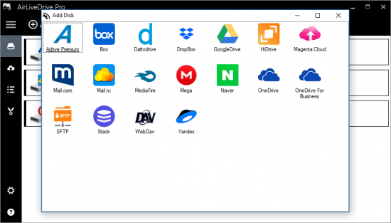 Air Live Drive works with the most important clouds and can add multiple accounts from the same cloud. Each account becomes a disk drive on your computer.