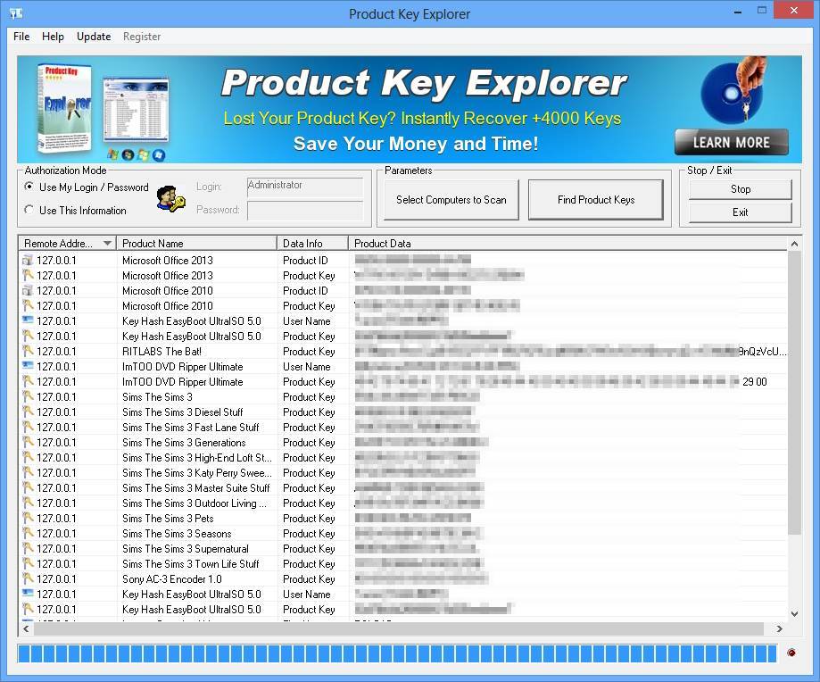 roduct Key Explorer - the program allows you to decrypt, see and save the serial numbers of Microsoft products, CD-keys of programs installed on your computer, and not only them. The incomplete list of software whose registration data can be seen and saved: Microsoft Windows (XP, 2003, Vista, 7, 8, 10), Microsoft Office 2003, Microsoft Office 2007, Microsoft Office XP, Microsoft Visual Studio 2005, Agnitum Outpost Firewall, Macromedia , Ahead Nero, Adobe Photoshop, CyberLink PowerDVD, Borland Delphi, Alcohol 120%, etc. (support more than 2500 programs). After starting the program, it will suffice to press the key search button and it will scan the registry itself, and will display a list of programs installed on the computer and registration data for it. The program has a window for authorization of the Administrator, if restrictions are set at the user level.