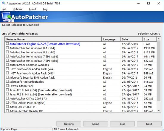 AutoPatcher Updater is a simple application that can detect necessary system updates and enable you to download them from the Internet easily and fast.The interface is simple and clean, comprising nothing more than a list of the available updates for your system and a button to access the 'Options' section. In order to detect the available updates, the application verifies the AutoPatcher servers for the latest module releases and enables you to download the ones you need. The list of available releases displays the release name, the language and the date of the most recent update. It includes patches for the AutoPatcher engine, AutoPatcher for Office (XP, 2003 and 2007), Office Addon Packs, DirectX updates, addon packs for .NET Framework, Adobe Air and Adobe Reader, as well as Microsoft Redistributables and the original XP registry tweaks.