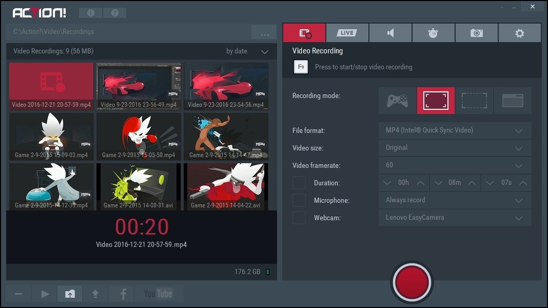 Built-in managers for recordings, benchmarks and screenshots allow to browse, delete selected items and export recordings to popular formats and devices. With outstanding performance and sleek design Action! defines new standard of user experience for games benchmarking, gameplay and desktop real-time recording software.