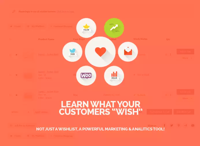 Simply adding the product to wishlist encourages users to come back, but together with such options as follow, social share, fully manageable private and shared wishlists, promotional emails and so on… makes it a powerful marketing tool. Integrated analytics will help you build your sales strategy and drastically increase revenue.