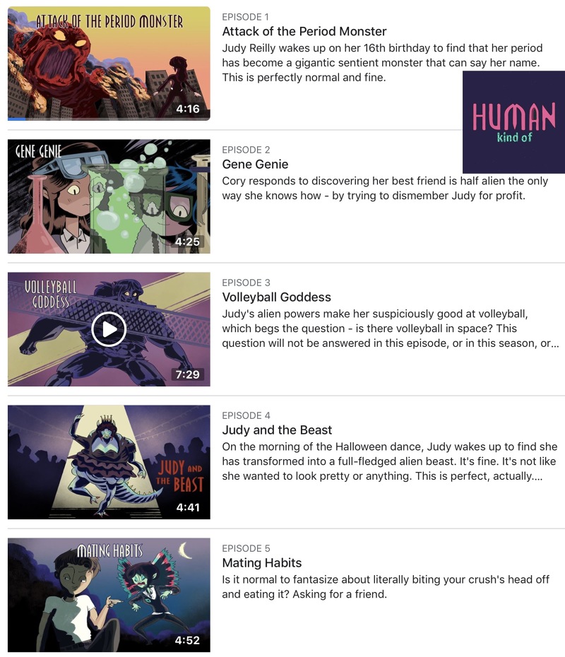 Human Kind Of is an American animated comedy web television series created by Diana McCorry that premiered on September 16, 2018, on Facebook Watch. It begins when Judy Reilly, a nerdy teenager, finds out her estranged father was an extraterrestrial and realizes "surviving a half-alien adolescence seems pretty hopeless. But with the help of a dangerously upbeat mother and a comic book obsessed best friend, Judy is able to uncover her powers, stand up to bullies, and inevitably discover what makes her both alien and human along the way."