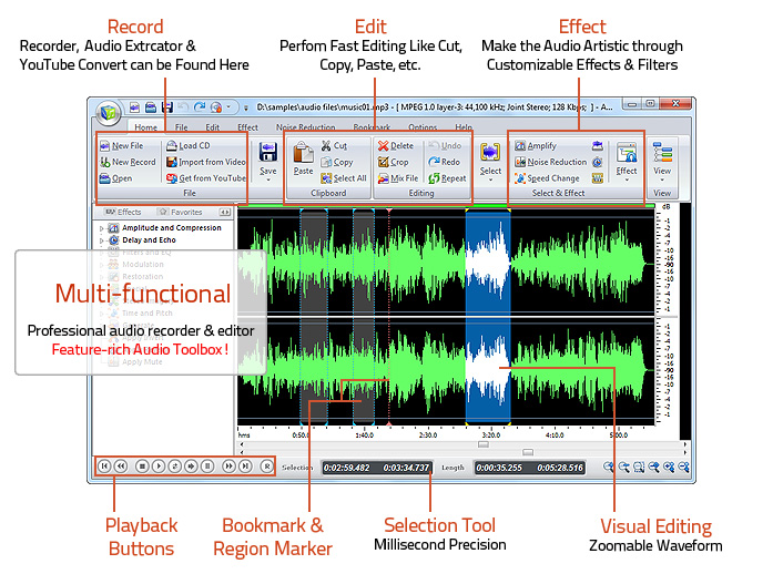 Audio Record Edit Toolbox Pro is a professional audio editor and recorder, which completely control over all aspects of audio editing and mastering. It contains all features of Audio Record Edit Toolbox. It performs precise editing and creates 30+ audio effects & filters. It is your last destination for professional audio recording and mastering, sound design, audio restoration, and audio CD creation.