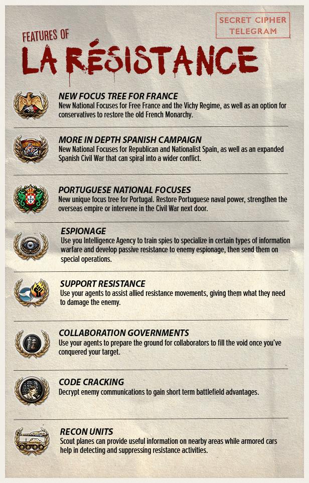 La Résistance adds secret agents, espionage missions and new options for resistance movements to Hearts of Iron IV, the popular grand strategy wargame from Paradox Development Studio. Send agents into dangerous territory to decipher enemy secrets or prepare the ground for your invasion by propping up collaborators who will be happy for any taste of power.