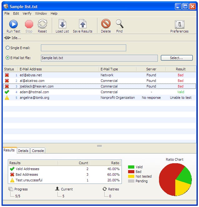 eMail Verifier can save time and money for businesses who send newsletters to their clients, nonprofit organizations who send bulletins to their members, or any person or business that needs to maintain a clean e-mail contact list.