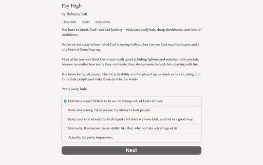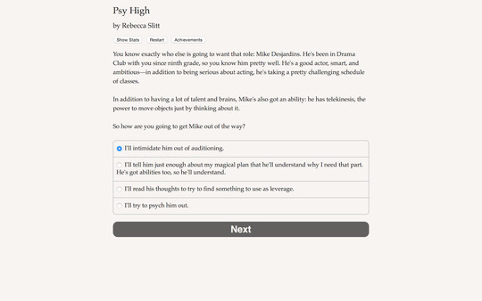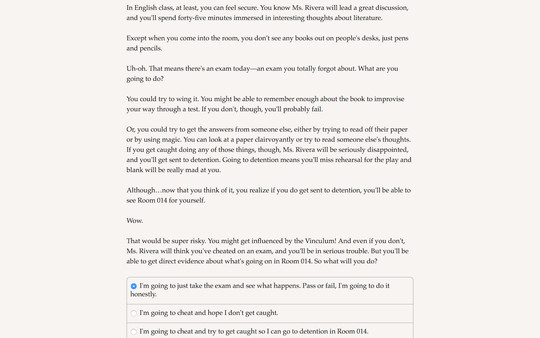 Interactive teen supernatural mystery! You and your friends have developed magical psychic powers. Solve the case, save your school, find a date for prom!