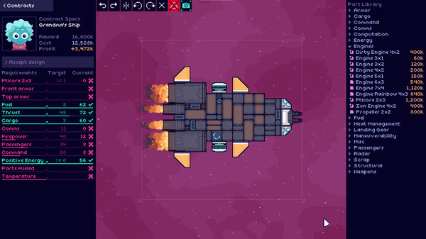 Welcome to Sunshine Heavy Industries! As the new spaceship engineer, solve increasingly tricky design puzzles with your own personal style. Manage customer demands, juggle budget and ship performance, and survive the extremely poor decision making skills of your business partner.