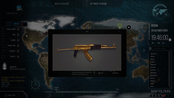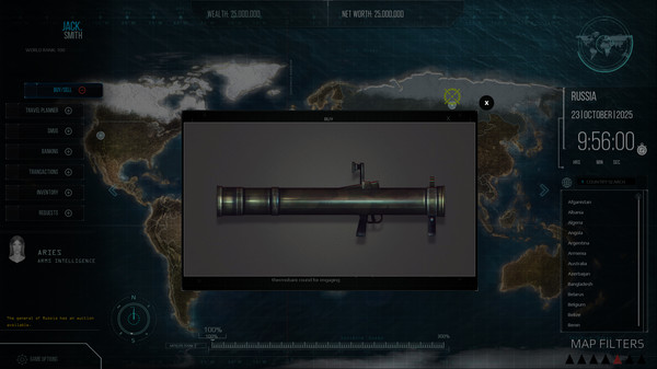 As a new Arms Dealer in the year 2025 you will bribe generals, build relationships, and trade over 250 real weapons. You'll be hunted by 4 law enforcement agencies as you compete with the top 10 Arms Dealers. You must find the best deals, rarest weapons and most useful vehicles to carry your goods.