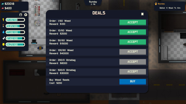 Grow, package, and sell weed while managing personal needs and furnishing your own home. Make friends with the community of Weed County by day and make drug deals at night. Buy properties and businesses to launder dirty money and pay off the debt hanging over your head.