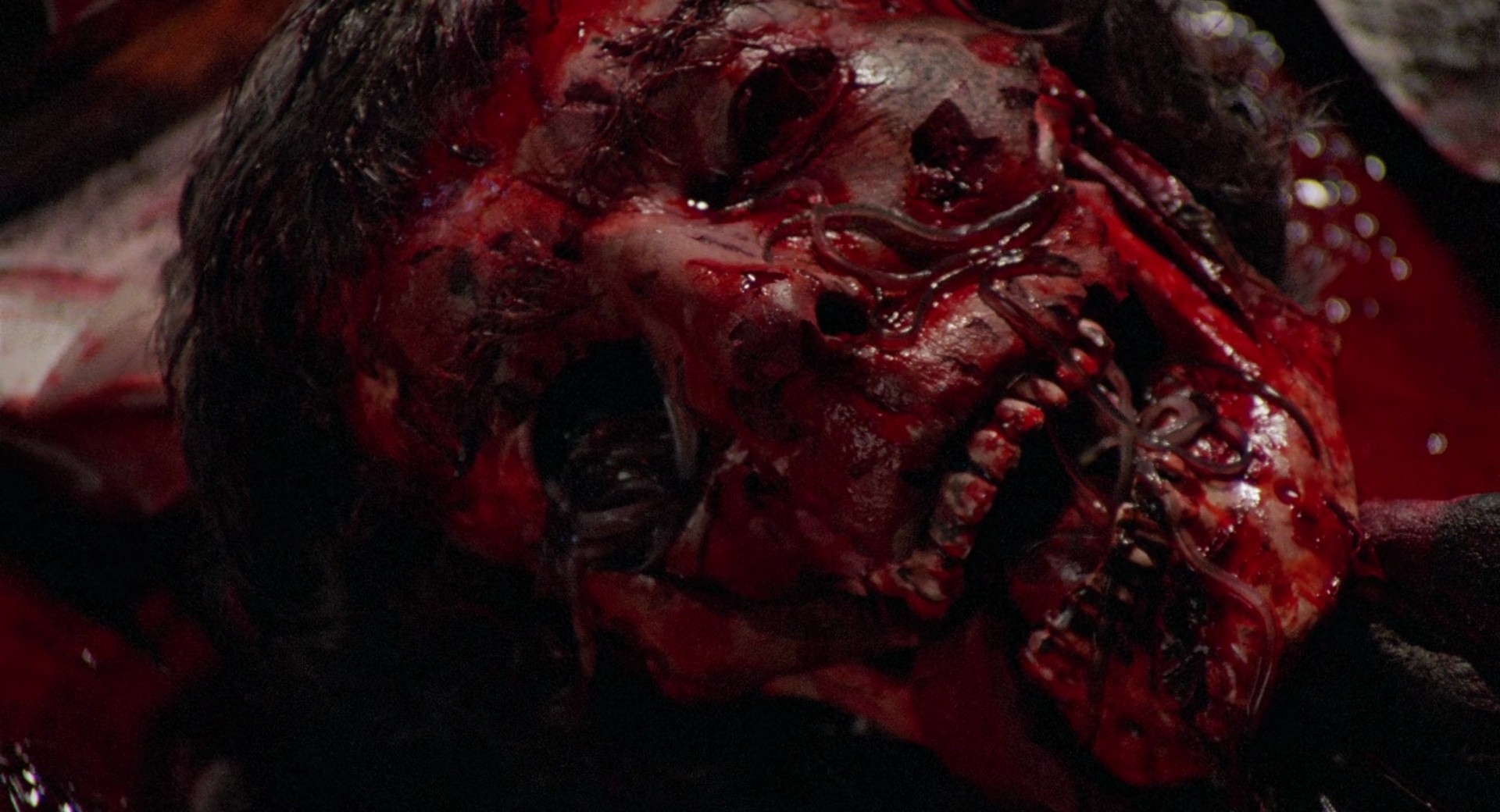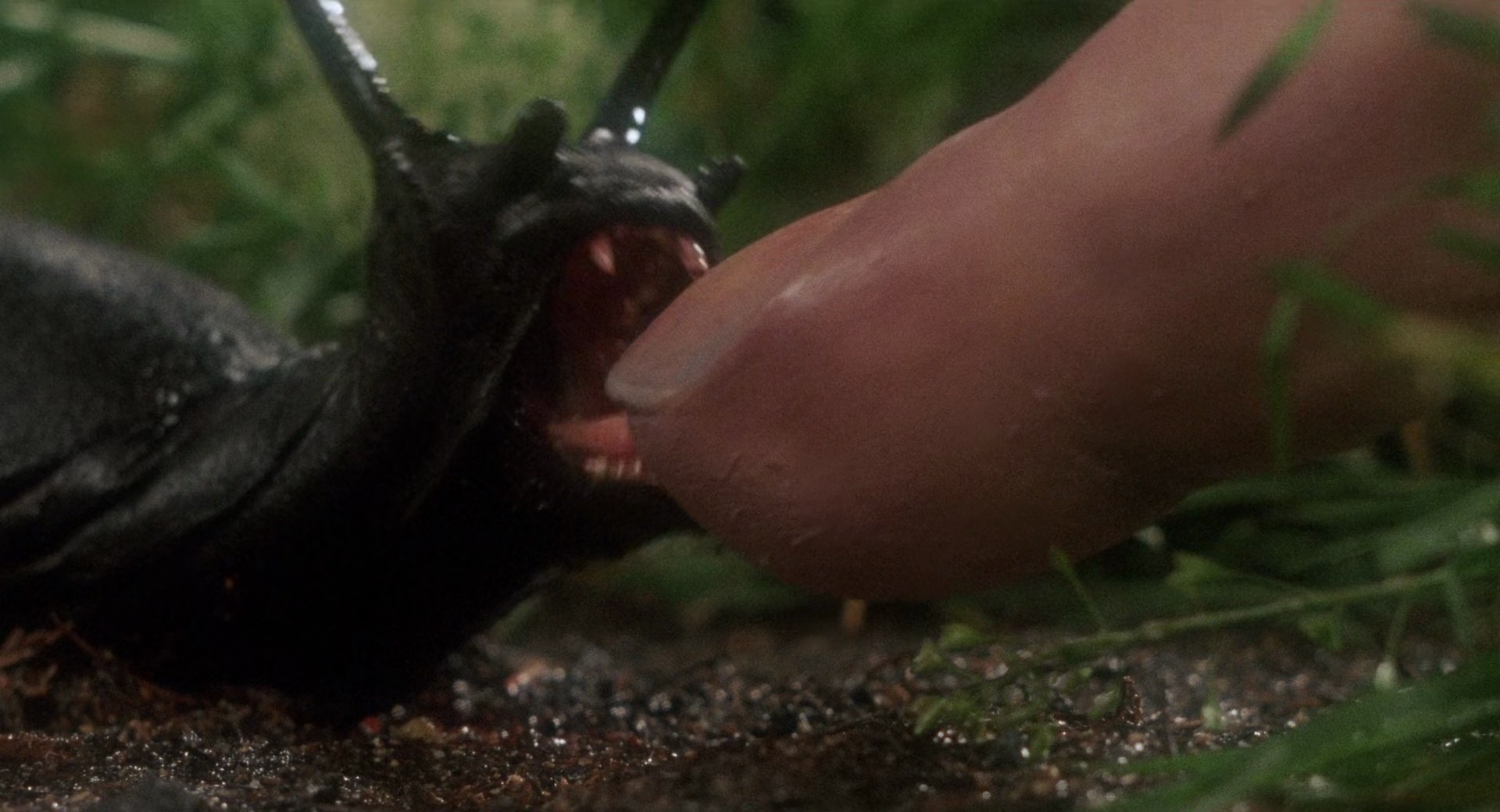 Note : Spanish trashmaster Juan Piquer Simón's foray into making movies in the US, after the triumph of Pieces continues with this derivative nature horror. It's basically Jaws if the shark was man-eating slugs, sheriff Brody was a health inspector, the mayor wanted to have a new mall built instead of keeping beaches open, and everyone was really, really relentlessly horny all the time. I'm not joking, this is the horniest movie about killer slugs ever made, if people aren't having sweaty, headboard-bumping sex, they're talking about how they want to have sex later, or how they had sex earlier. The effects are surprisingly good (and occasionally pretty gruesome), the close-up of the slug biting a guy's finger is the single greatest screenshot I've ever posted to this site, and hey, it's Slugs.