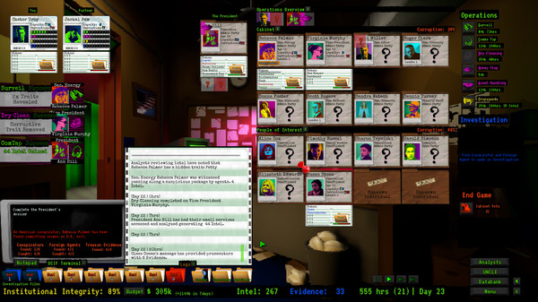 Race against the clock to stop the President and their conspirators from destroying the integrity of American institutions. Starting with only meager funds and dogged perseverance, you will conduct an intelligence investigation of the President’s circle of aides, advisors, and donors.