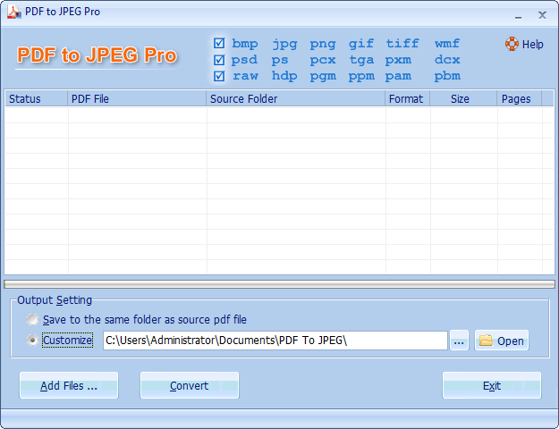 PDF To JPEG Pro is a windows utility that quickly converts PDF documents into JPG, TIF, BMP, PNG, GIF and other popular image formats. Users are able to customize DPI and Page Range in conversion setting. Also, PDF To JPEG Pro supports Batch Mode that converts hundreds of PDF documents into images at a time.