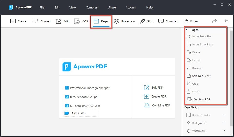 ApowerPDF also provides ideal solution for managing PDF pages, you can easily use it to split a PDF with multipage, delete, insert, and rotate pages. In addition, you are capable of customizing page design by modifying/adding a header, footer, background, etc.
