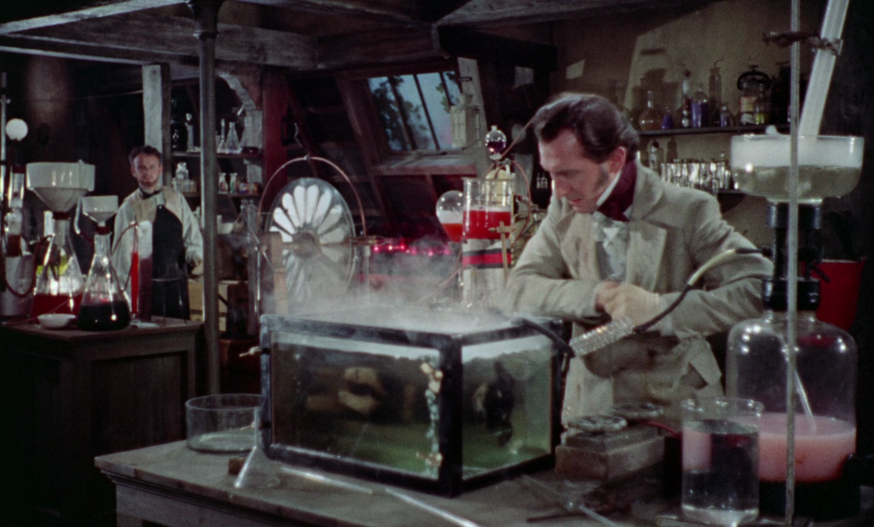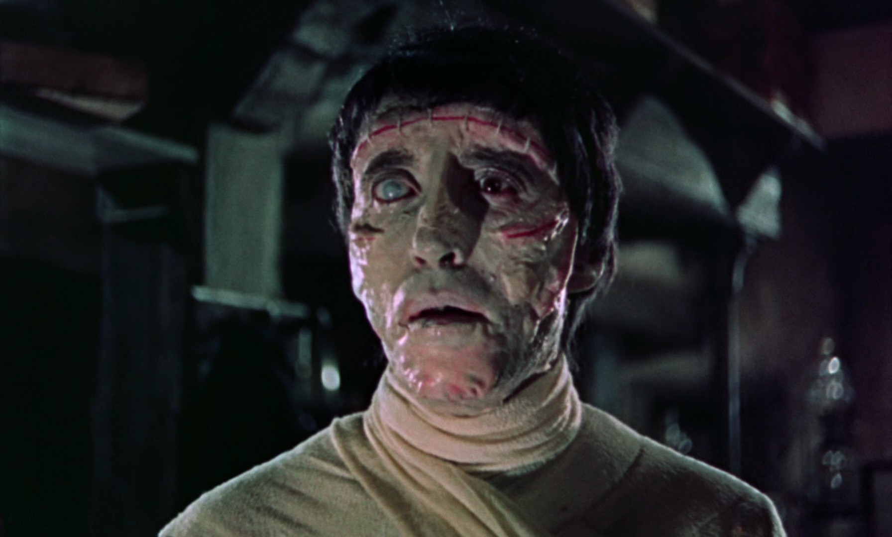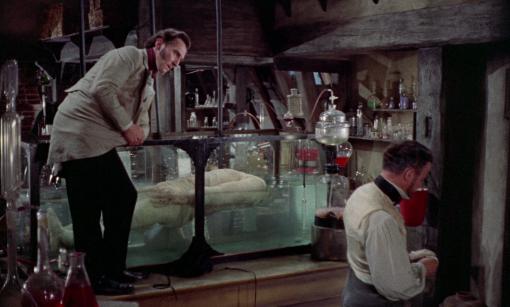The story is fairly loosely based on Shelley's novel, making Frankenstein a more explicitly evil and unscrupulous figure (at least towards the end), and ending with him meeting his well-deserved end at the hands of law and order. The Baron is unwaveringly dedicated to his research, not minding the death of his friends and colleagues in the process, and inevitably alienates everyone. Lee's monster is not very present, although he's quite memorable when he's on screen, but this is not the story of the monster, but rather the moral failings of the mad scientist.