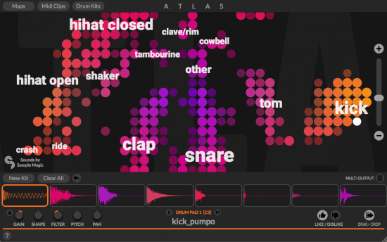 Find that perfect sample faster. Atlas’ AI can find and categorize every drum sound on your computer and create a map you can scroll and zoom with all your samples in one place.