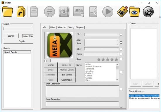 MetaX will read any metadata information that is in the file, but it also makes it easy to search for information on the Internet. It will automatically search Amazon (and you can set which country's Amazon site to use) and tagChimp (a great source of information. To donate click below) to retrieve information on a movie. You can also bring up IMDB for additional information, as well as Barnes & Noble for chapter information, and Yahoo Posters for cover art. You can also use your own cover art.