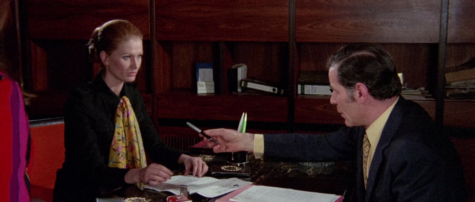 In London, a younger woman married to an older businessman who spends most of his time away in Greece (shades of Mrs. Wardh here) is with her lover when she receives word that her husband has died in a plane crash. It turns out he's taken out a million dollar insurance policy with her as the beneficiary, and she needs to travel to Greece to cash out. Arriving, she runs into a suspicious insurance investigator who seems to think she might have had something to do with her husband's death, but when she receives the full payout in cash and is promptly murdered in her hotel room while preparing to return to London, the suspicions of the Greek police and the Interpol fall on the multiple shady characters who were circling around her trying to get a piece of the money.