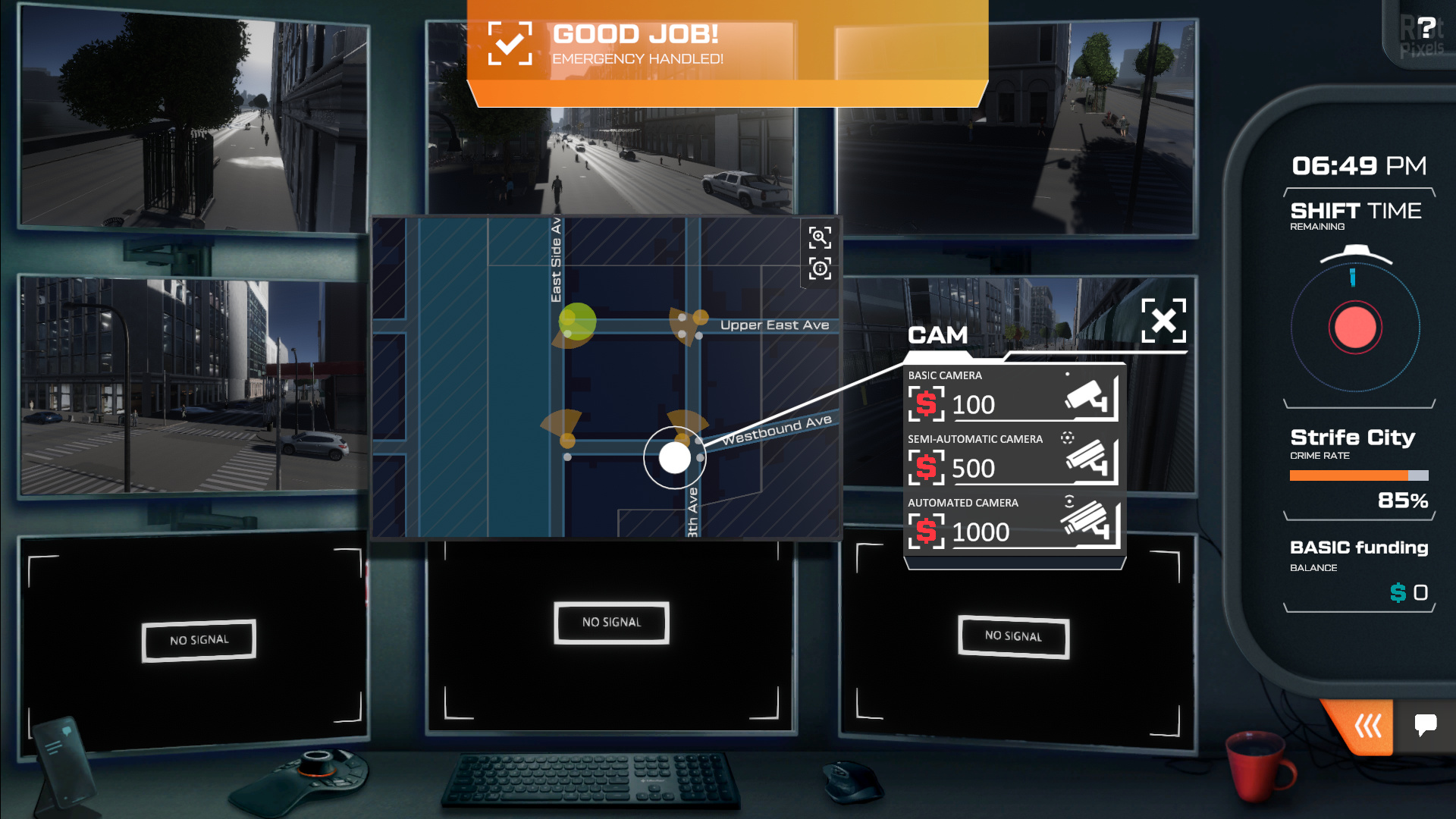 - Stay alert, be everywhere! Operate cameras and have precise insight into every district you feel may be endangered. Use this to your advantage and find the danger before it’s too late!