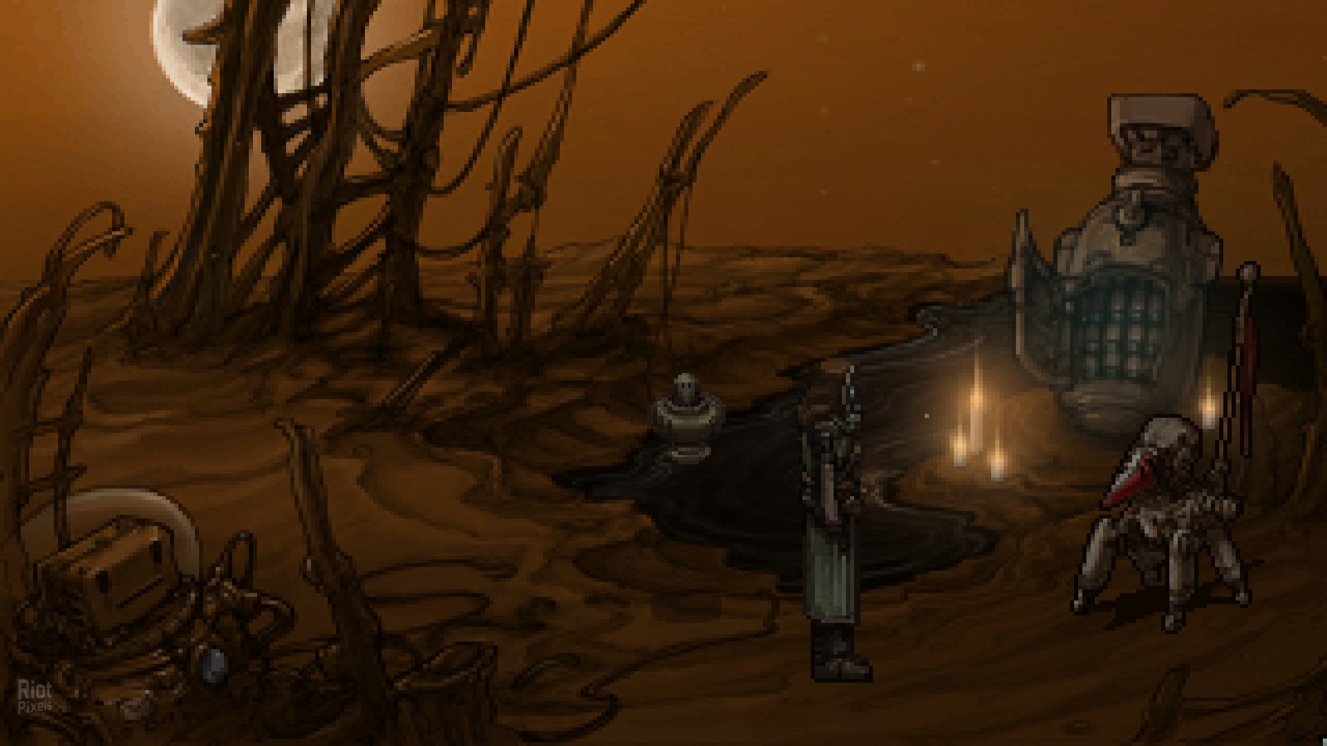 Set in a post-apocalyptic world strewn with cast-off machines, Primordia tells the story of Horatio Nullbuilt, a stoic robot who values his solitude and independence. Horatio spends his days studying the Book of Man, sparring with his droid companion Crispin, and tinkering with the airship they call home — a peaceful existence that becomes threatened when a rogue robot steals the energy source that the pair needs to survive.
