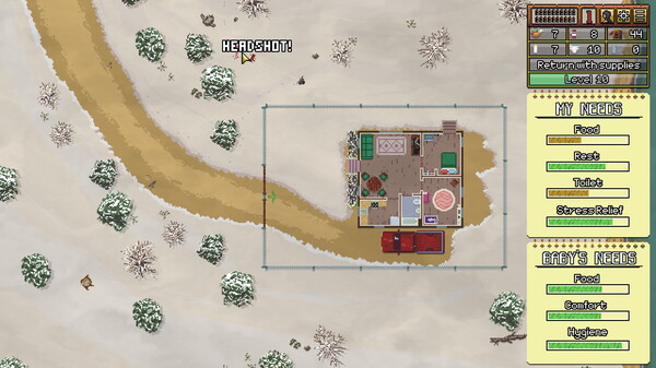 Eat, sleep, and shoot zombies in this survival simulator with roguelite elements. Battle to survive until you die and do it all over again. Level up your skills and keep your child alive as you fight to escape your wintry hell.