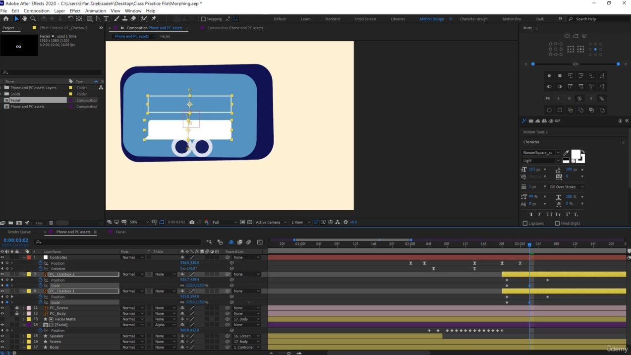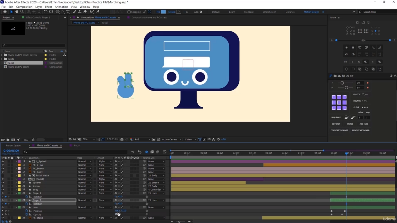 Hello and welcome to this course. In this course, I will teach you how to morph one shape into another. So you might ask, what is morphing? Morphing is an effect which sees one shape or object transform into another in a seamless transition.They are two ways to morph a shape, and we will learn them during this course. At first, we will learn the fundamentals of morphing, and then we will morph a phone to a PC. We will learn how to build a strong rig first. And then we will work on the transition between the phone and the pc. We will fix the common issues that you might face during this course . We will learn how to create secondary animations for our characters. How to give our animation a good feeling . we will learn how to create smooth moves during the transitions with the help of graph editor.This course is good for users who already have a basic knowledge of aftereffects. what I mean is that you should atleast be able to set a keyframe or work with layers in order to understand this course better. but don’t worry I have covered the basics as much as I could. so even if you are new you won’t be facing any problems.