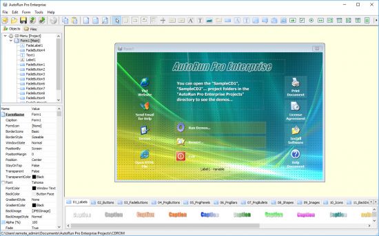 AutoRun Pro Enterprise includes 40 built-in object types. You simply add them onto a form and then edit their ‘properties’ and ‘events’ to customize them however you want. You’ll be able to layout your graphic user interface as fast as you can drag and drop!