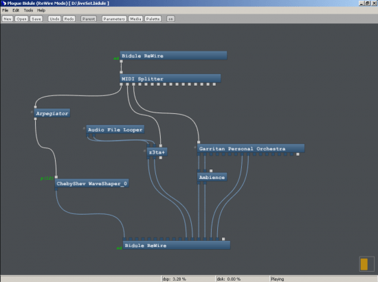 Bidule is a realtime modular creation studio aimed mainly at artists seeking a new creative environment to experiment with. With Bidule, you create your own live music creation environment, inserting audio and MIDI devices, ReWire Devices, VST instruments and plugins. Patching them anyway you like, in realtime, while it plays.