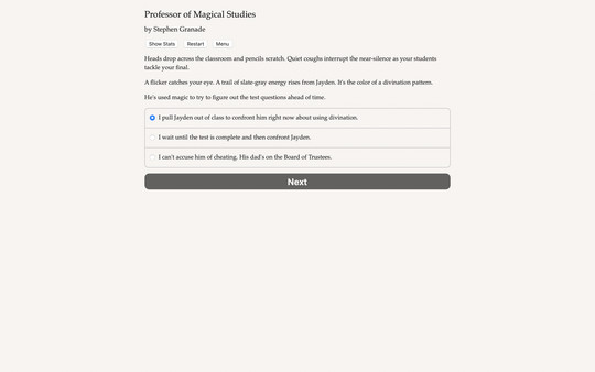 Professor of Magical Studies is an interactive magical school novel by Stephen Granade, where your choices control the story. It’s entirely text-based, without graphics or sound effects, and fueled by the vast, unstoppable power of your imagination.