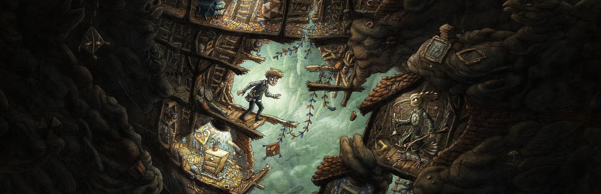 The ground starts shaking, light bulbs are breaking - and something rather unusual is happening right behind the walls of your very room. Equipped with nothing but wit and courage, you slowly descend into a world inhabited by avian folk and seemingly deadly furniture monsters.