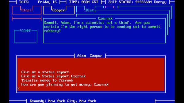 The year is 2087 and mankind has no time to lose. The time continuum is inexplicably unraveling by the hour, threatening to destroy the planet Earth. Travel back in time in this text-based adventure to prevent the assassination of President Kennedy and prevent the destruction of Earth.