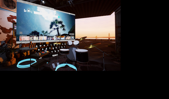An immersive drum kit simulation in a virtual garage on a beach.