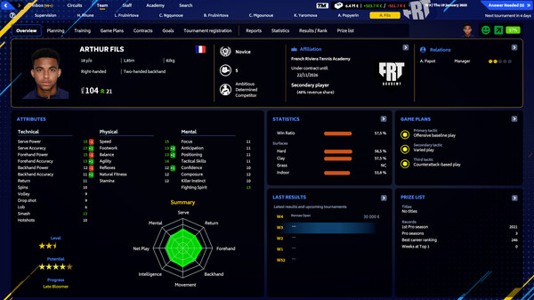 Immerse yourself in the ultimate tennis simulation, where your decisions both on and off the court will shape the destiny of your academy. Be the number 1 manager and become a national Team Captain to lead your team to greatness. Serve your colors and win the World Cup of Tennis!