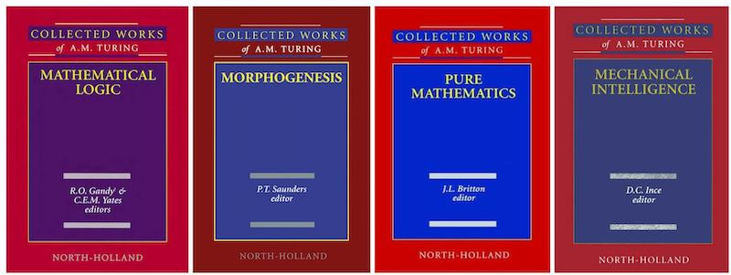 The COLLECTED WORKS (1992–2001) includes both published and unpublished materials, and comprises four volumes: Mechanical Intelligence, Pure Mathematics, Morphogenesis and Mathematical Logic. ALAN TURING: HIS WORK AND IMPACT (2013), edited by Barry Cooper and Jan van Leeuwen, does not contain all Turing's papers, not even all the published papers, but its commentaries are more extensive.