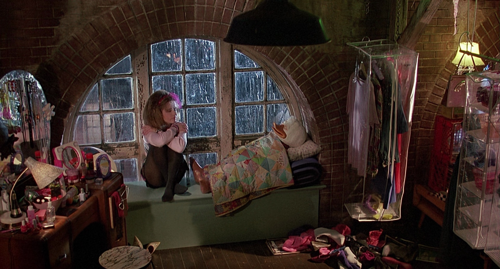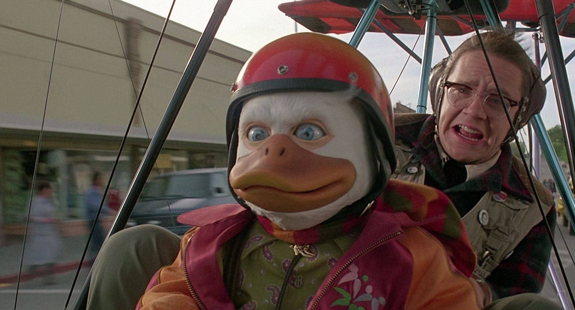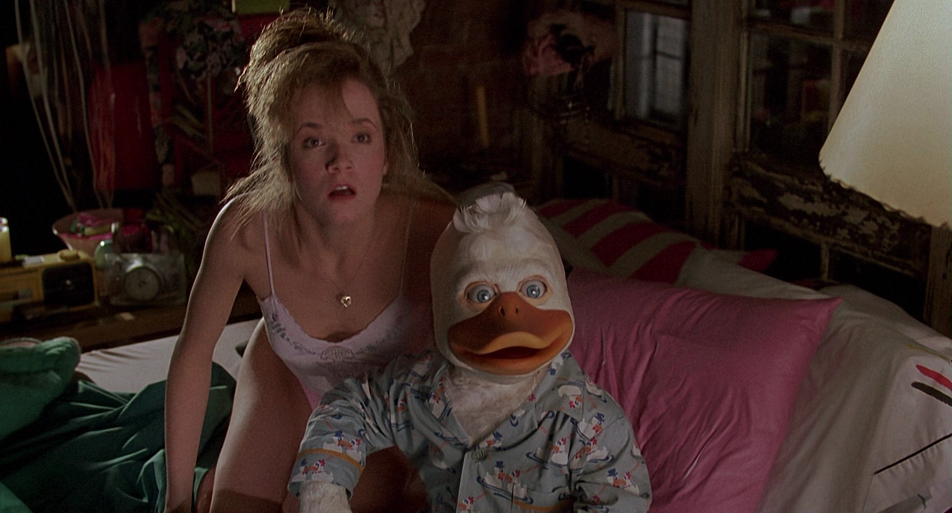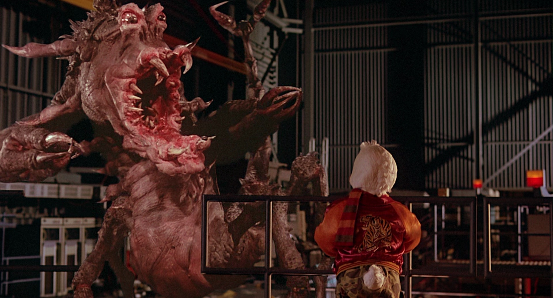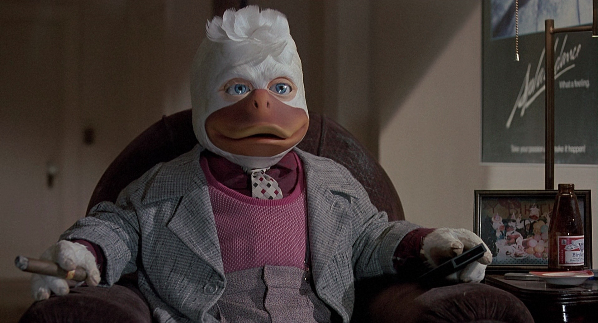 Howard is a vaguely human-shaped duck alien from the planet Duckworld, who's just settling in to masturbate in front of the TV when a weird cosmic gateway whips him and his favorite jerking chair through space and he lands on Earth, where he befriends a sexy rock star. He gets a job in some sort of sleazy massage parlor, then learns that he might be able to get back home, and goes to the lab where the science experiment that brought him to Earth was performed. However, as he arrives, another experiment fails, and this time it's brought something far more sinister to Earth (yes, it's John Carpenter Lovecraftian Monster).